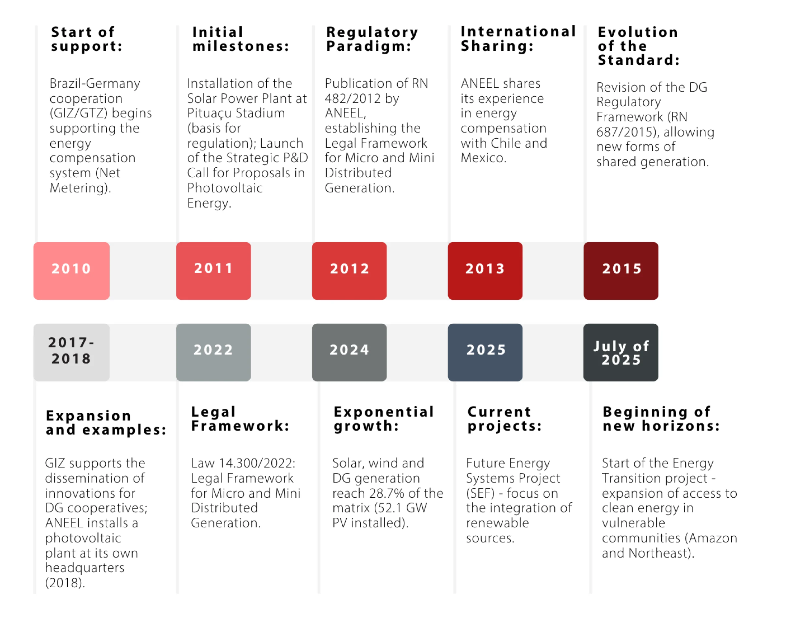 Under the coordination of GIZ, technical studies based on international standards were developed, technical visits to other countries were made, and pilot experiments with the compensation system were conducted. One of the highlights was the photovoltaic solar plant at the Pituaçu Stadium, installed by the Bahia State Electricity Company (COELBA), now Neoenergia, through the Energy Efficiency Programme (PEE), regulated by ANEEL.